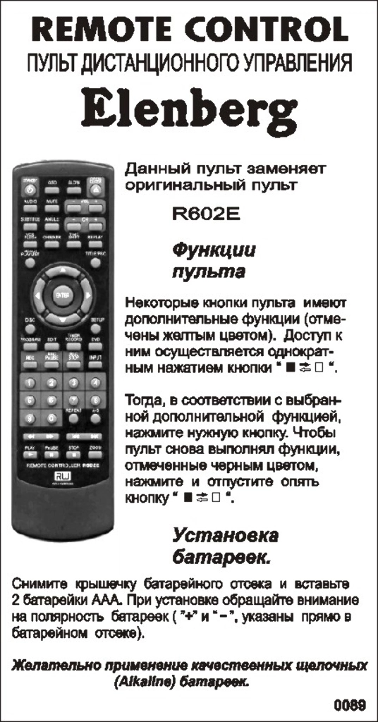 Аналог пульта Elenberg LCD-DVD 1902 для TV+DVD