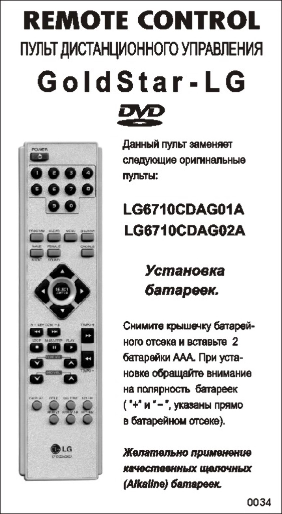 Аналог пульта LG 6710CDAG01A/02A для DVD плеера
