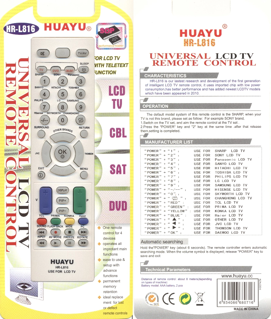 Универсальный пульт Huayu HR-L816 на 3 уст-ва TV/DVD/SAT