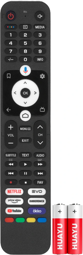 Пульт Huayu AN-1603 с голосовой функцией и батарейками для телевизора DEXP, Hartens, Centek, Leff, STARWIND, Digma, Hyundai, HI, ASANO, TopDevice, Harper, Novex, Витязь (VITYAZ), Telefunken, Skyline, Doffler, Accesstyle, SUNWIND, V-HOME, Tuvio, YUNO, ECON, RAZZ, BBK, Vekta, Maunfeld, Горизонт (Horizont), HIBERG, NEKO, Qwatt, Soundmax, Polar, RED Solution, Aceline, Erisson, Irbis, Polarline, Galatec