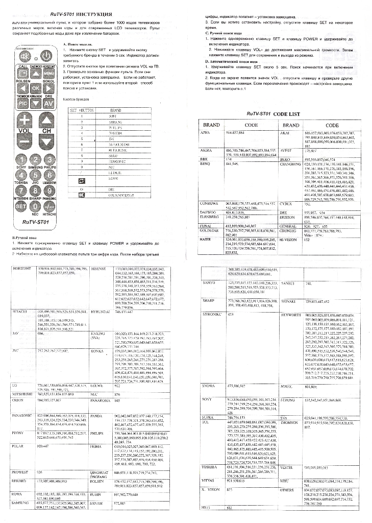 Инструкция на русском языке и таблица кодов в комплекте с каждым пультом.