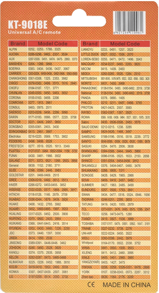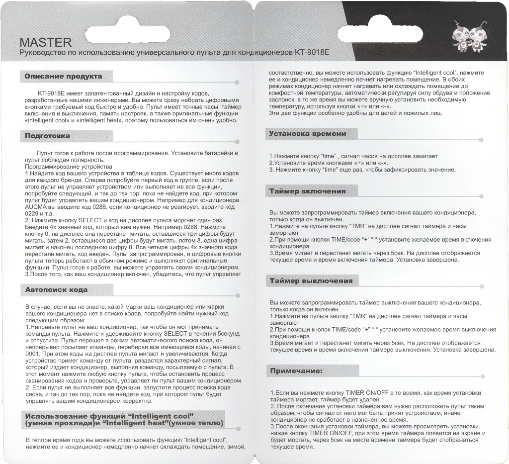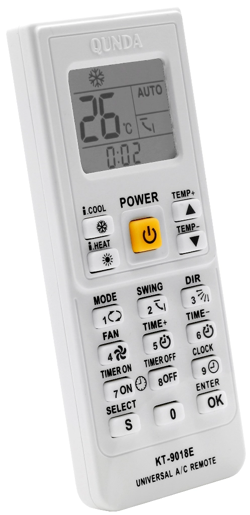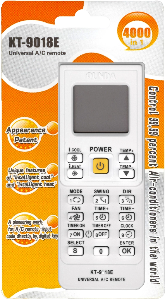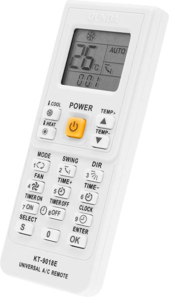 Qunda KT-9018E подходит для 98% различных марок кондиционеров, если они ранее управлялись с беспроводного пульта. Пульт высокого качества и легко настраивается с помощью ввода или автопоиска кода, подробная инструкция на русском языке в комплекте!