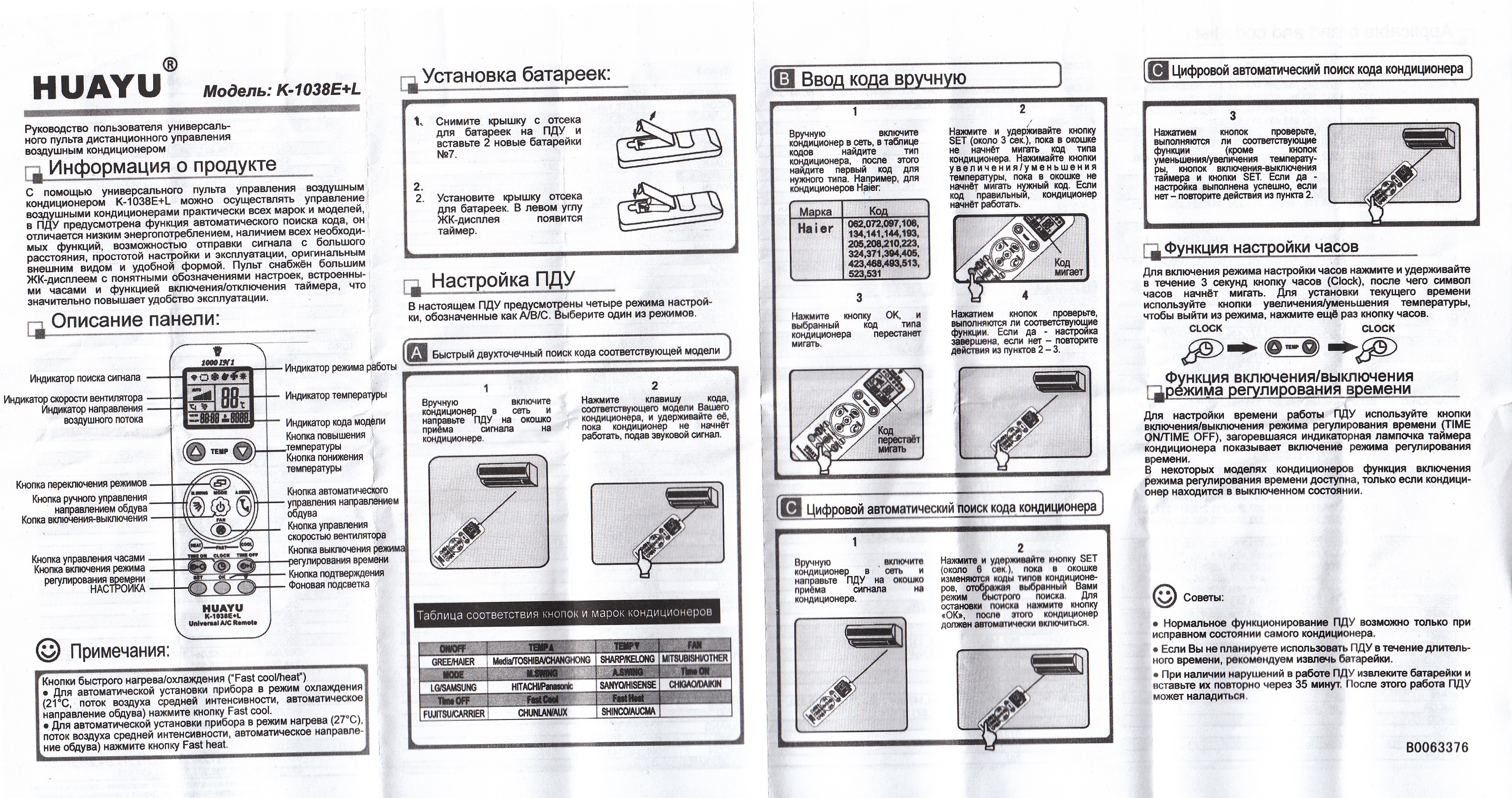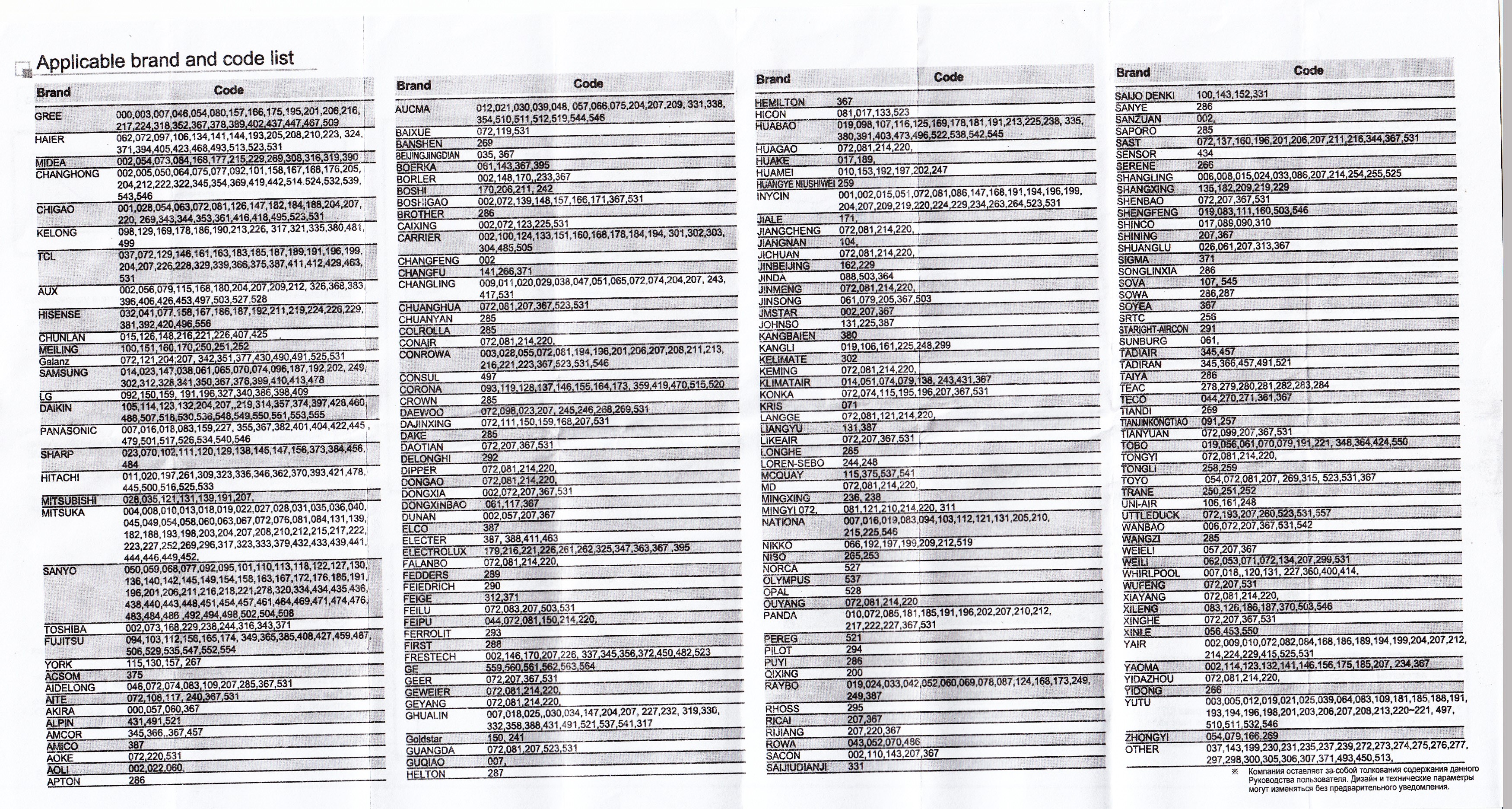 Пульт содержит в себе 1000 кодов и подходит для большинства кондиционеров поставляемых на наш рынок, даже если бренд не указан в таблице. Настройка пульта производится путем ввода или автопоиска кода, подробная инструкция на русском языке в комплекте.