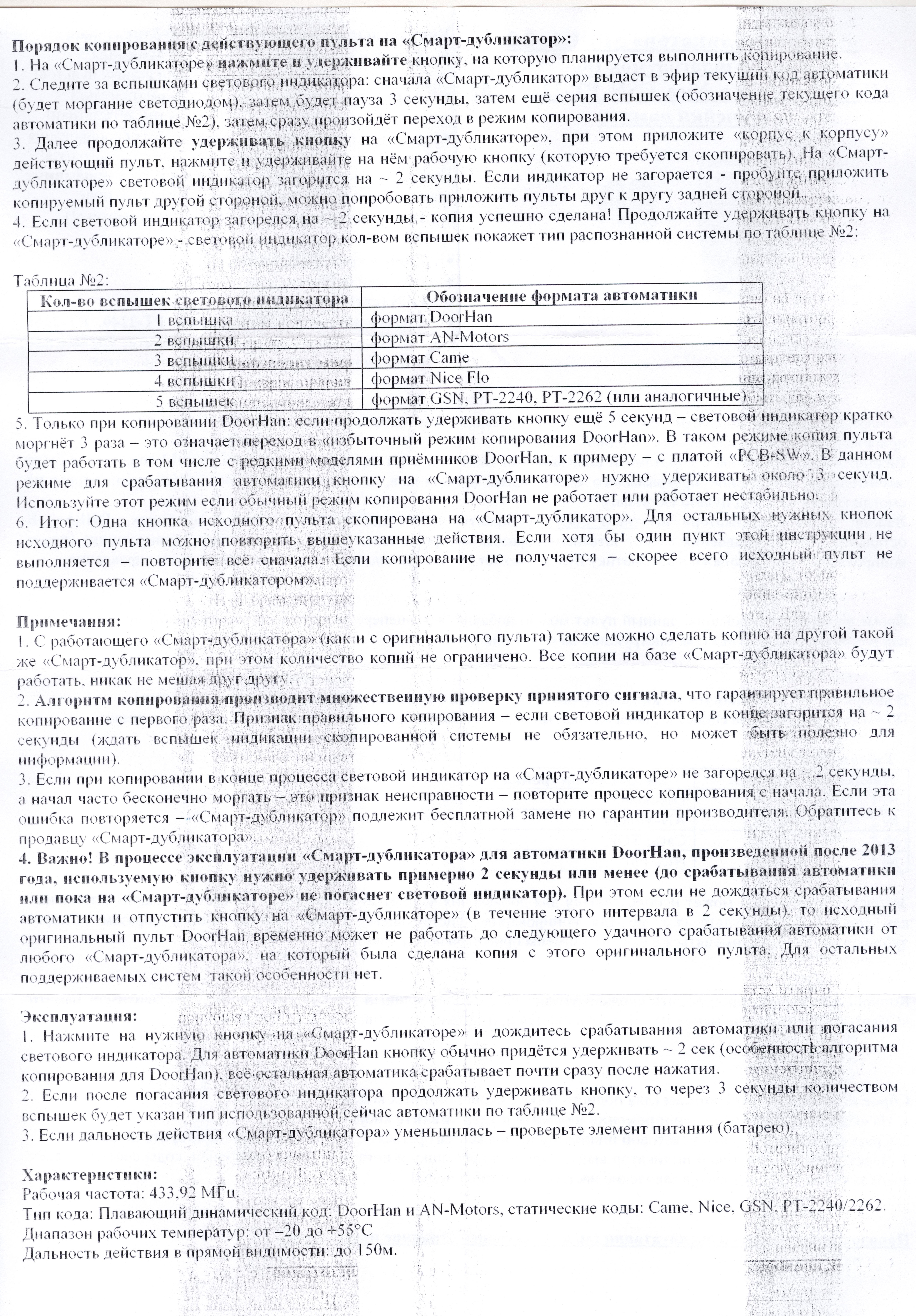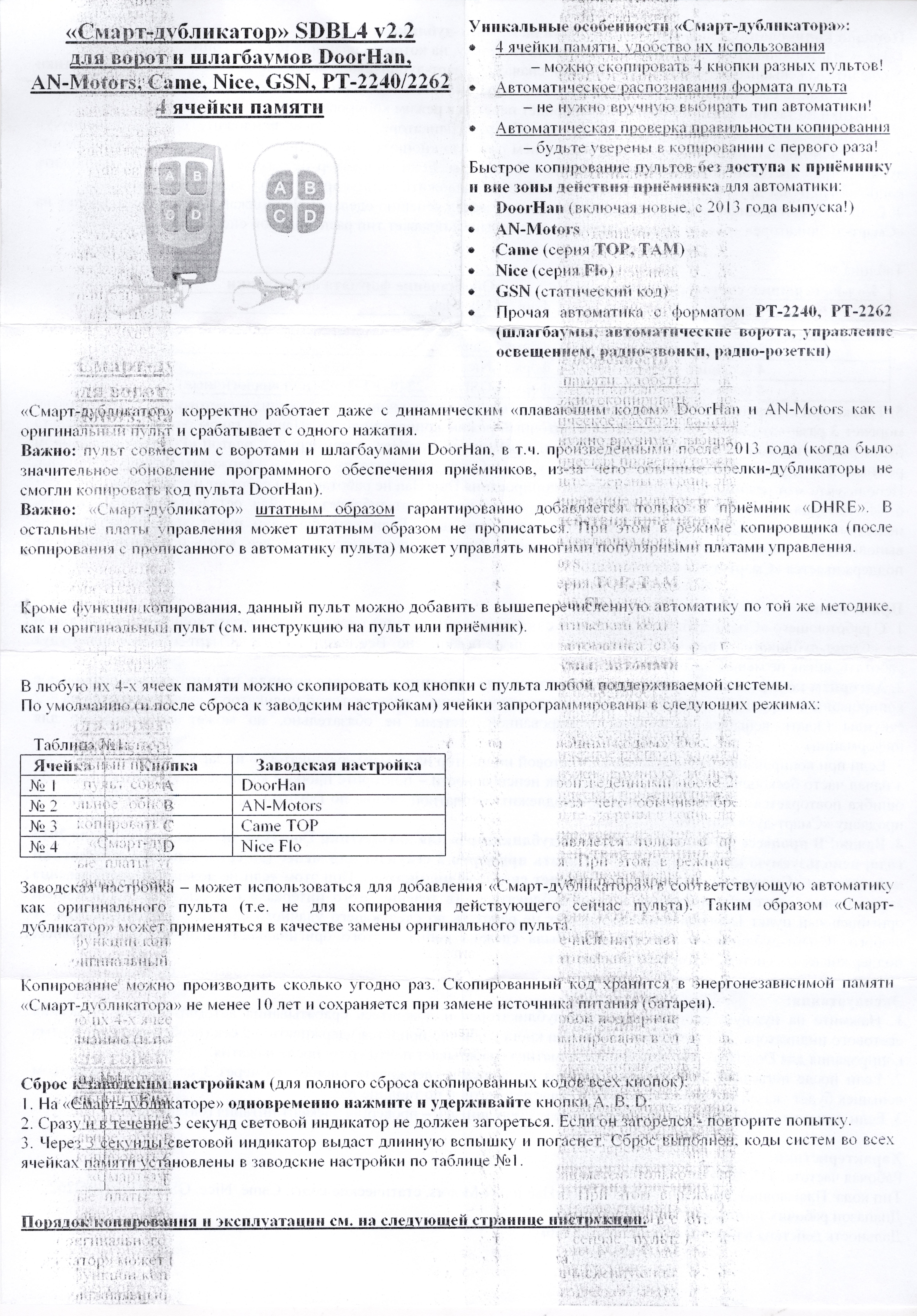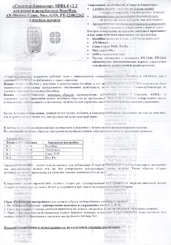 Кроме функции копирования, данный пульт можно добавить в вышеперечисленную автоматику по той же методике, как и оригинальный пульт (см. инструкцию на пульт или приёмник).