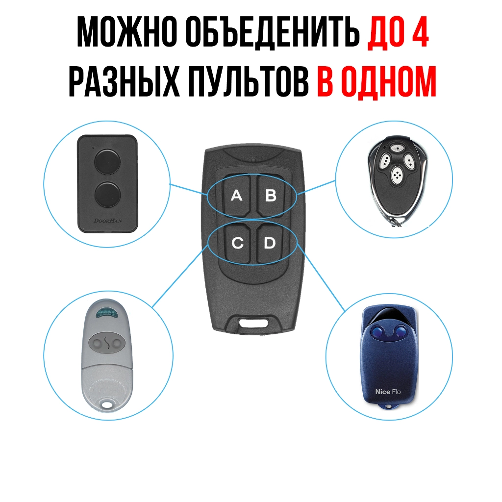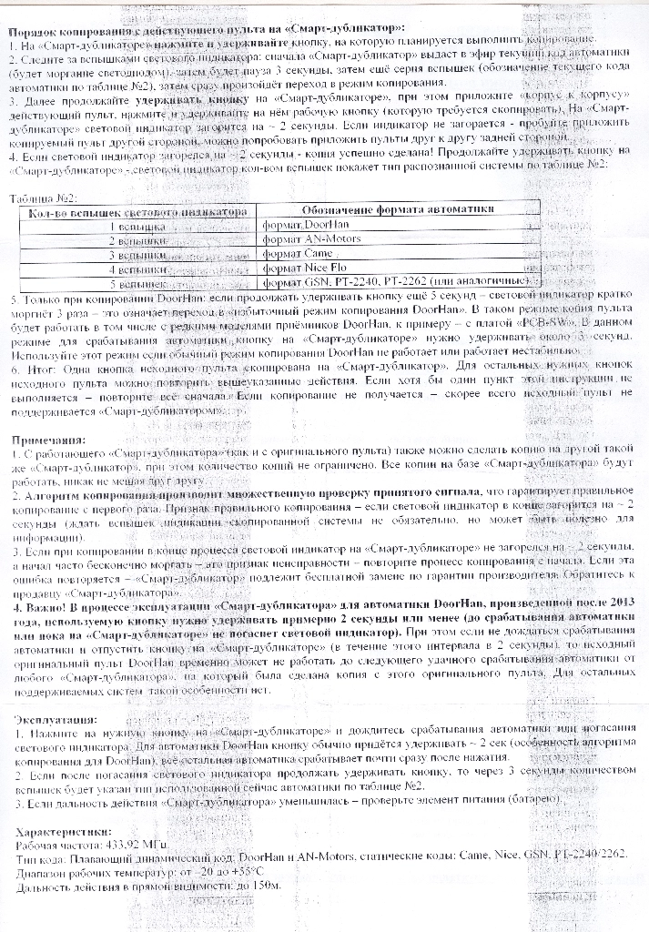 Особо важно: пульт совместим с воротами и шлагбаумами DoorHan, в т.ч. произведенными после 2013 года (когда было значительное обновление программного обеспечения приёмников, из-за чего обычные брелки-дубликаторы не смогли копировать код пульта DoorHan).