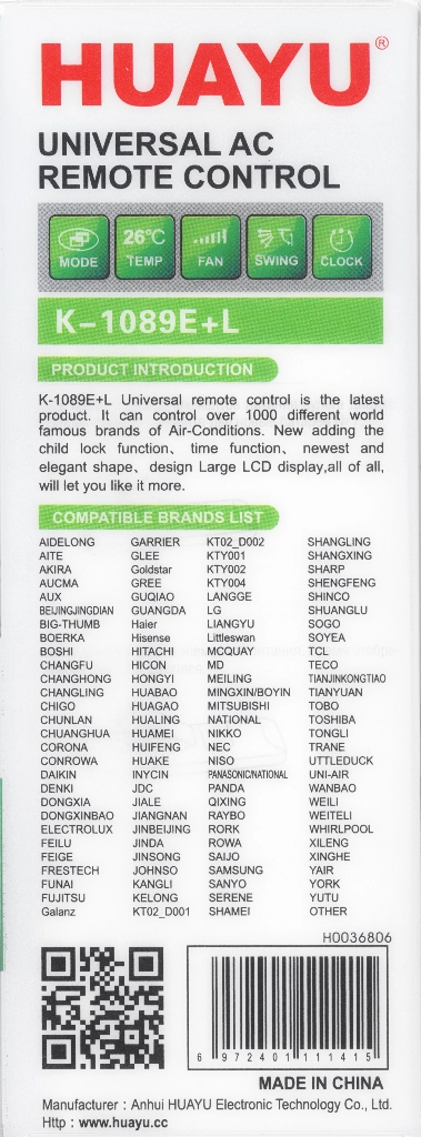 Универсальный пульт для кондиционеров Huayu K-1089E.
