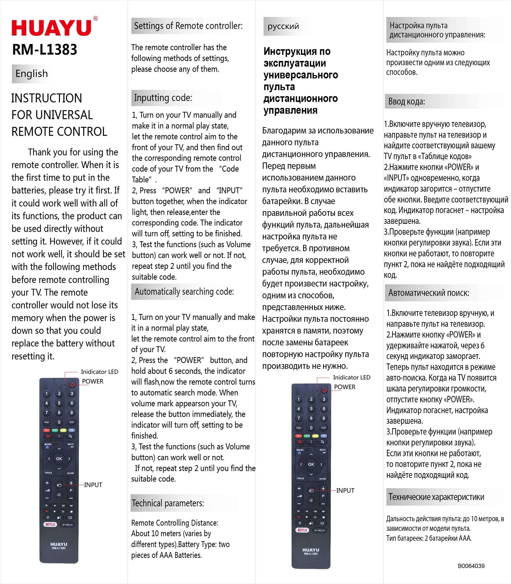 Пульт легко настраивается с помощью ввода кода, инструкция на русском языке и таблица с цветными изображениями поддерживаемых пультов в комплекте.