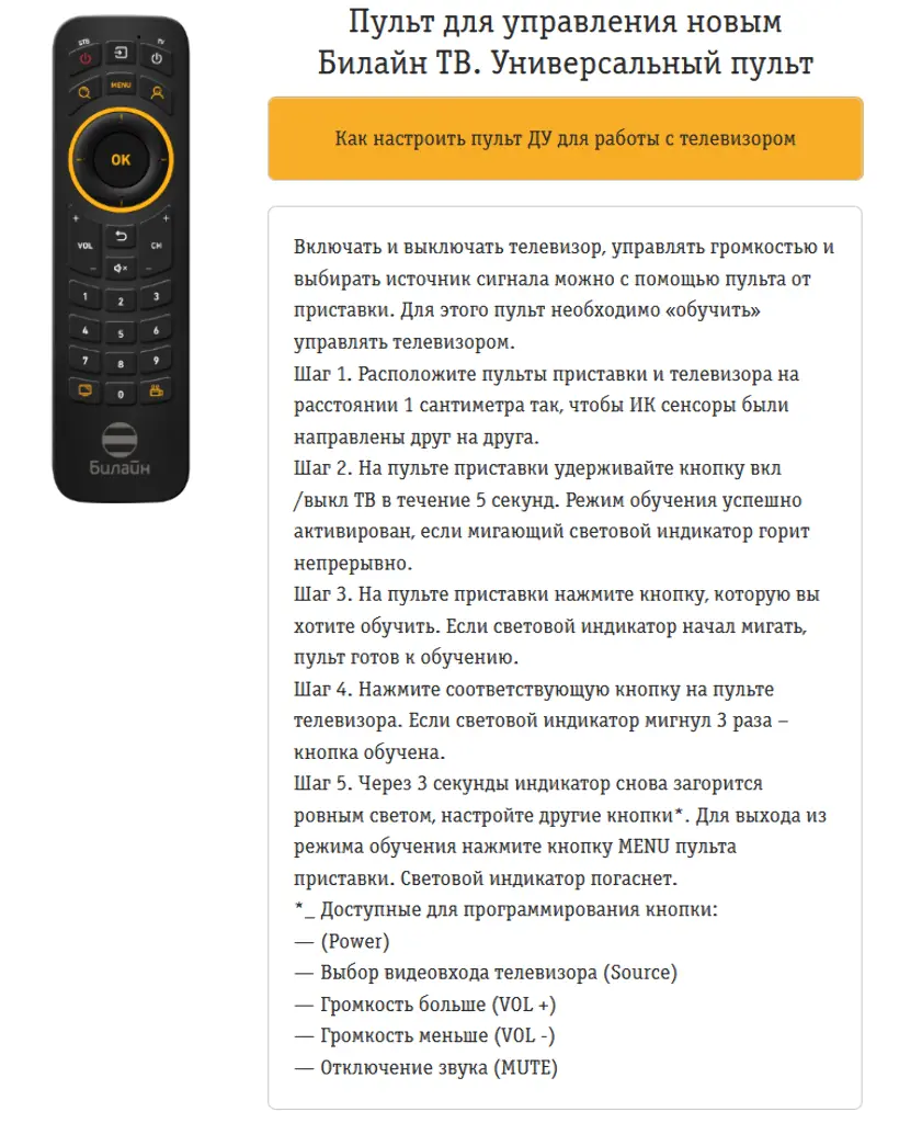 Универсальный пульт БИЛАЙН для приставок, универсальный с функциями управления ТВ.