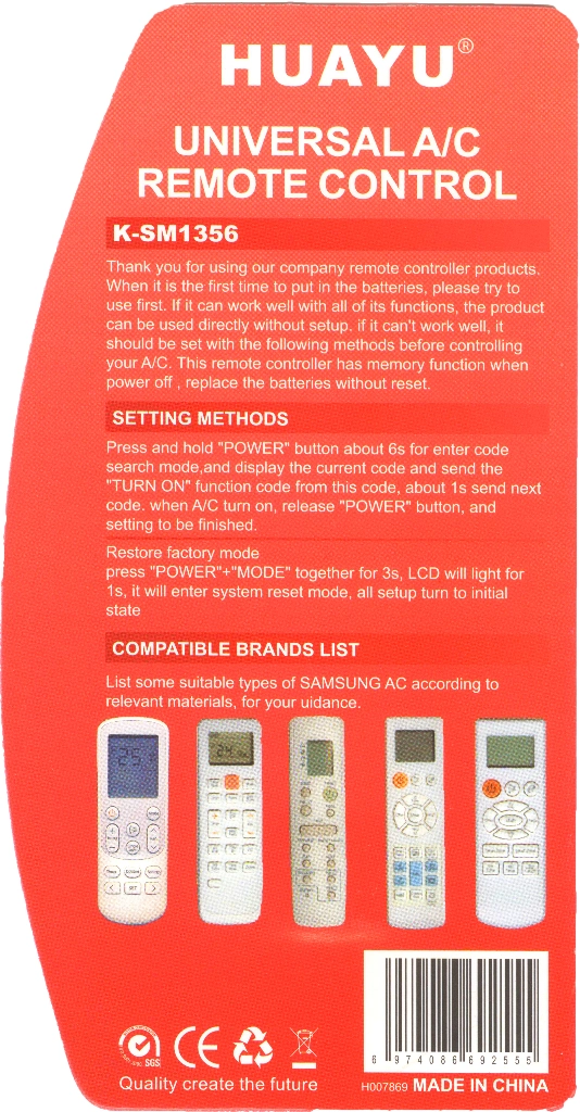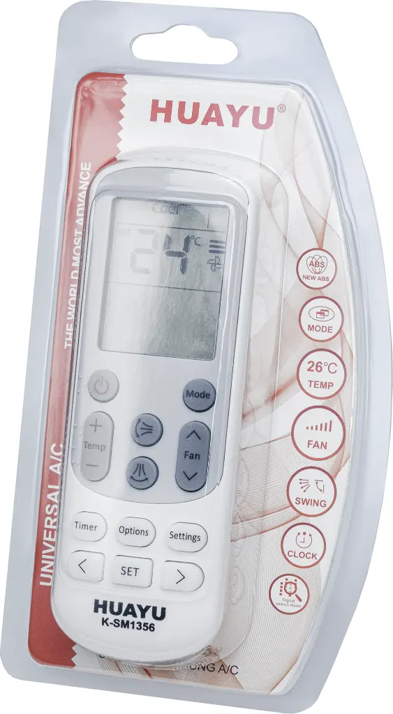 Разработан компанией Huayu специально для кондиционеров марки SAMSUNG. Подойдет практически для любого кондиционера SAMSUNG управляемого с беспроводного пульта.