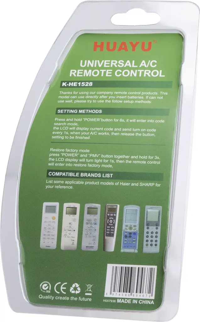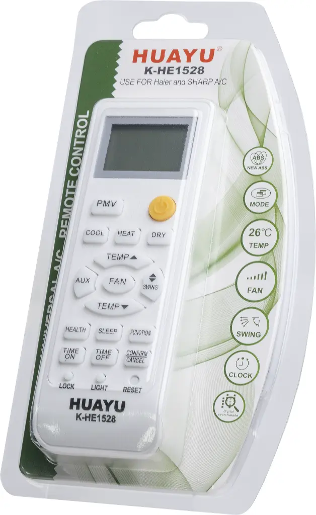 Разработан компанией Huayu специально для кондиционеров марки Haier и Sharp. Подойдет практически для любого кондиционера Haier и Sharp управляемого с беспроводного пульта.
