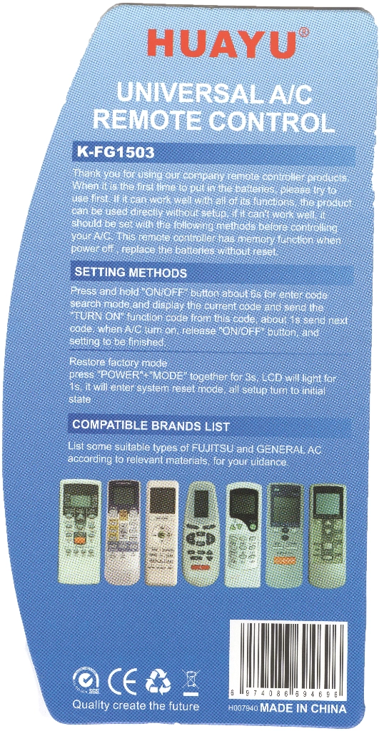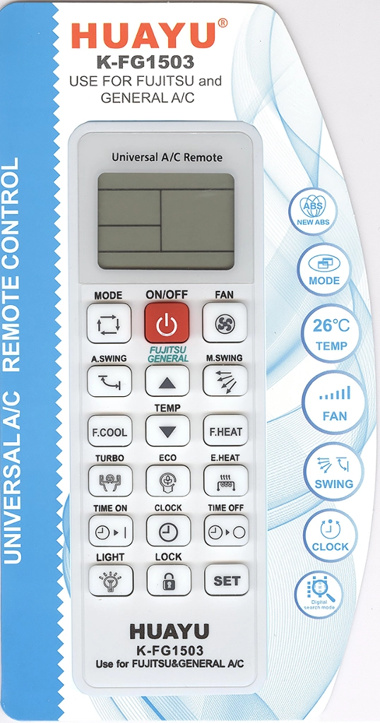 Разработан компанией Huayu специально для кондиционеров марки Fujitsu и General. Подойдет практически для любого кондиционера Fujitsu и General управляемого с беспроводного пульта.