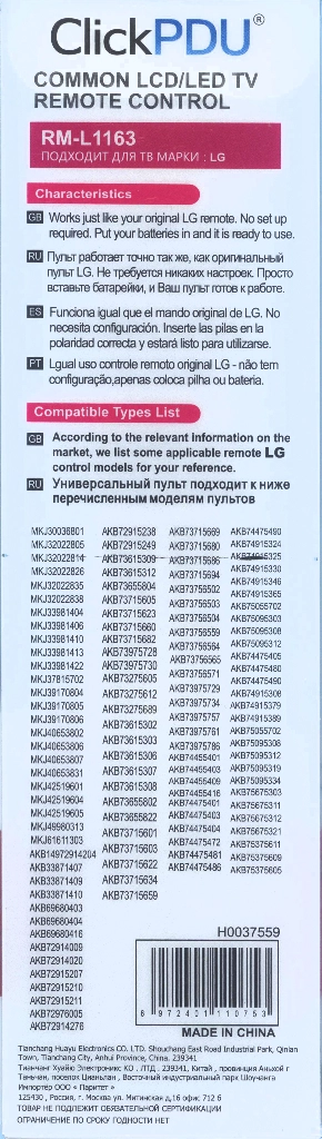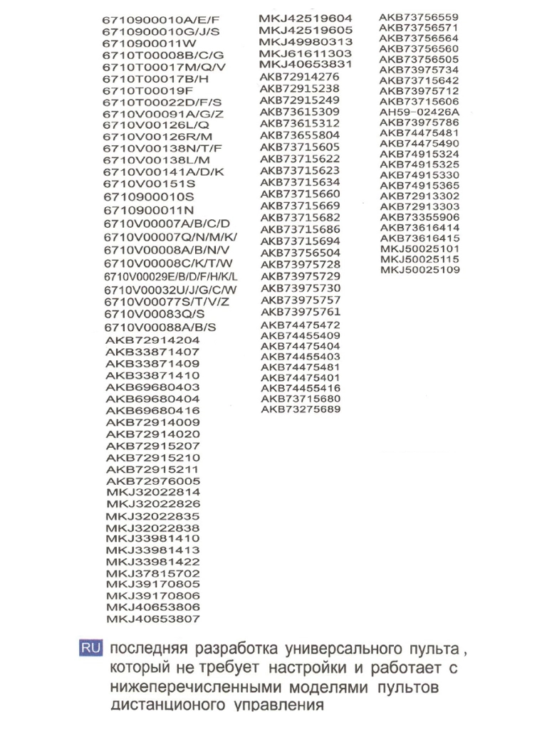 Рекомендуется для замены пультов: AKB75675301 AKB76037605 AKB75095307 AKB75095312 AKB73975702 AKB75095308 AKB76037608 AKB75675303 AKB75675311 AKB75675321 AKB73715601 AKB74915324 AKB73975702 AKB75095319 AKB73715603 AKB73715605 AKB73715606 AKB73715622 AKB73715634 AKB73715637 AKB73715639 AKB73715642 AKB73715654 AKB73715669 AKB73715679 AKB73715686 AKB73715694 AKB73975712 AKB73975716 AKB73975728 AKB73975729 AKB73975734 AKB73975757 AKB73975758 AKB73975761 AKB73975778 AKB73975786 AKB73975789 AKB74475403 AKB74475405 AKB74475434 AKB74475441 AKB74475451 AKB74475479 AKB74475480 AKB74475481 AKB74475485 и другие модели в схожих корпусах.