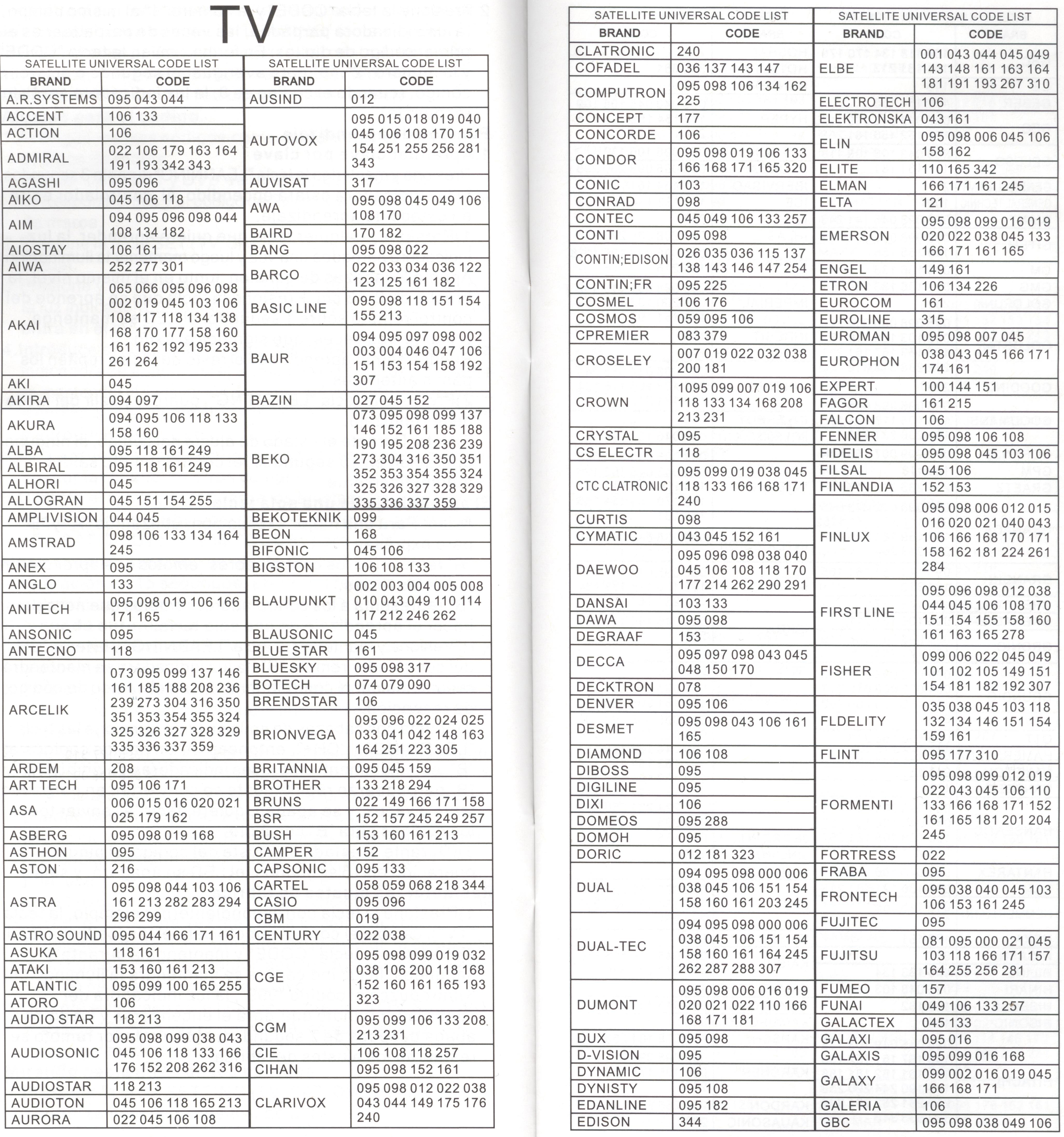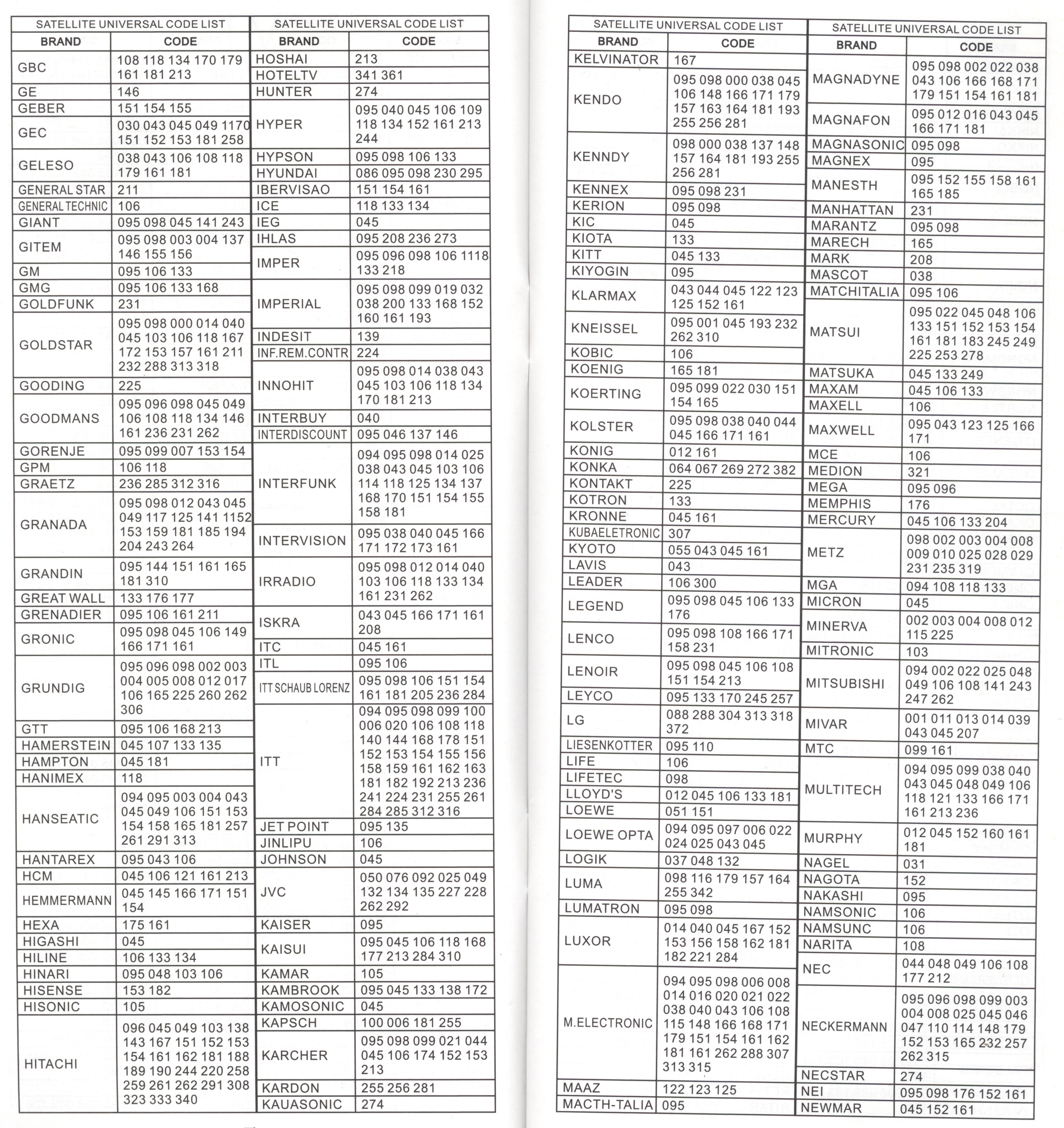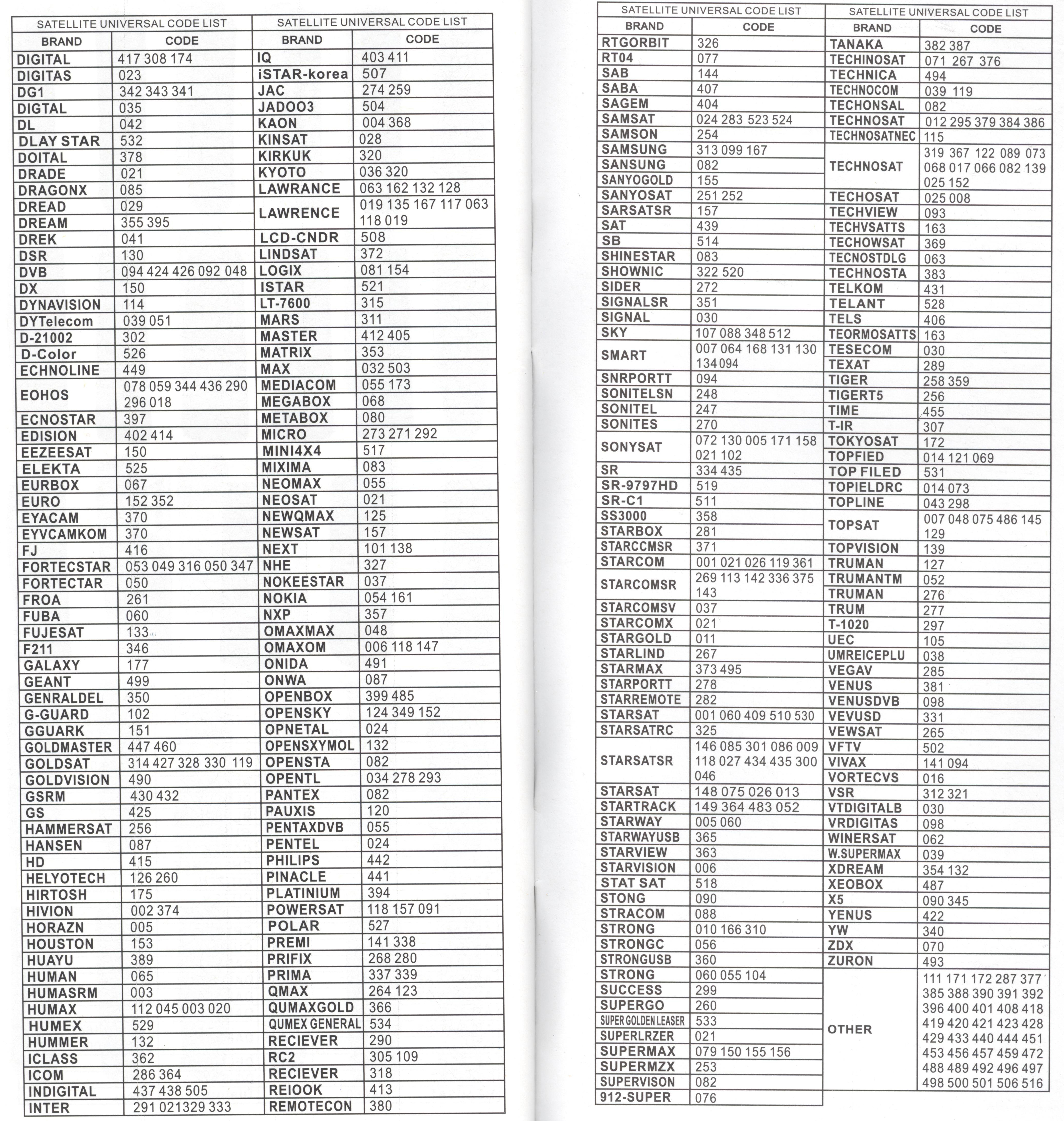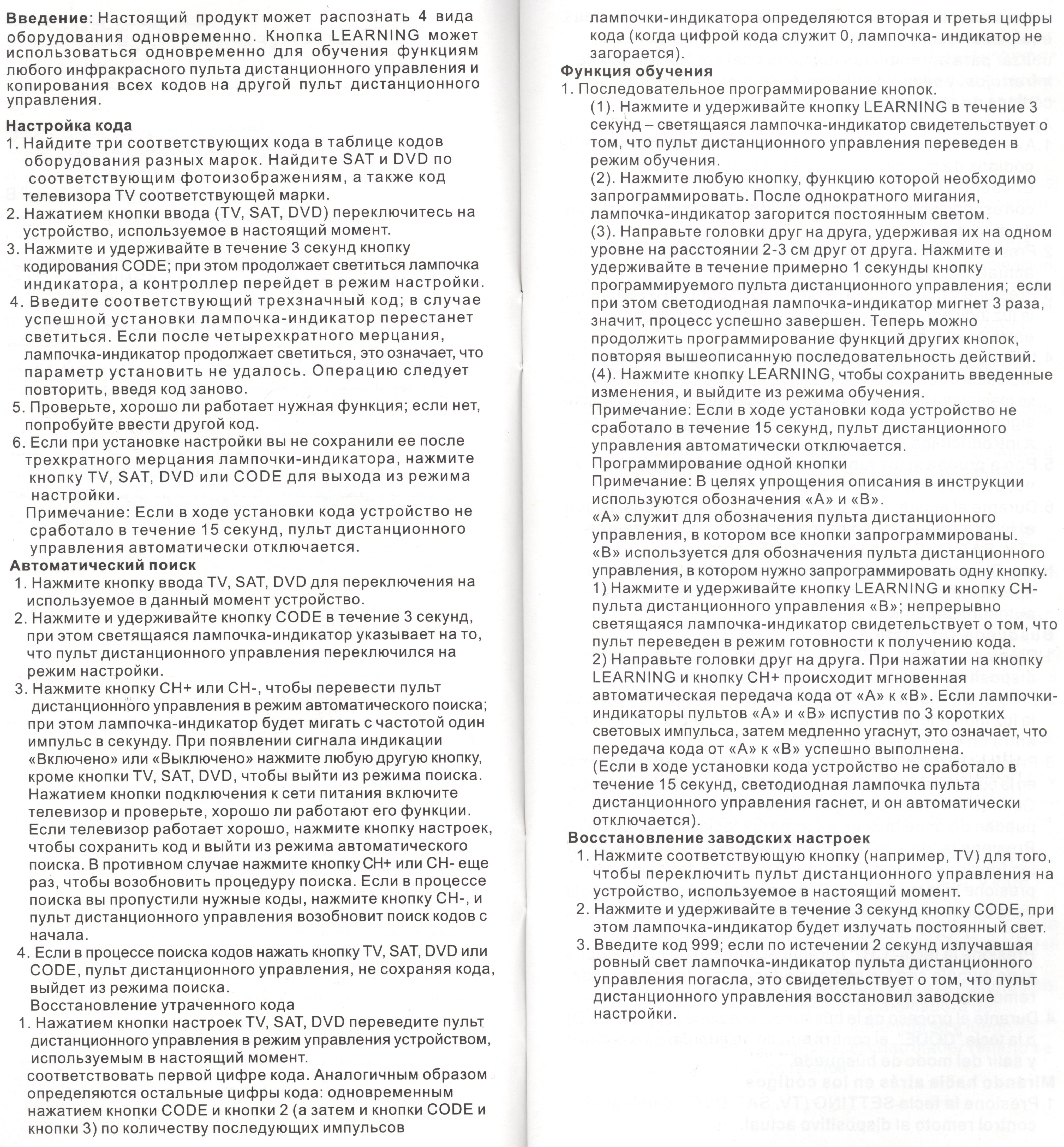 В комплекте с пультом идет подробная инструкция на русском языке, а также обширная таблица кодов с цветными изображениями заменяемых пультов. Более 3000 кодов!