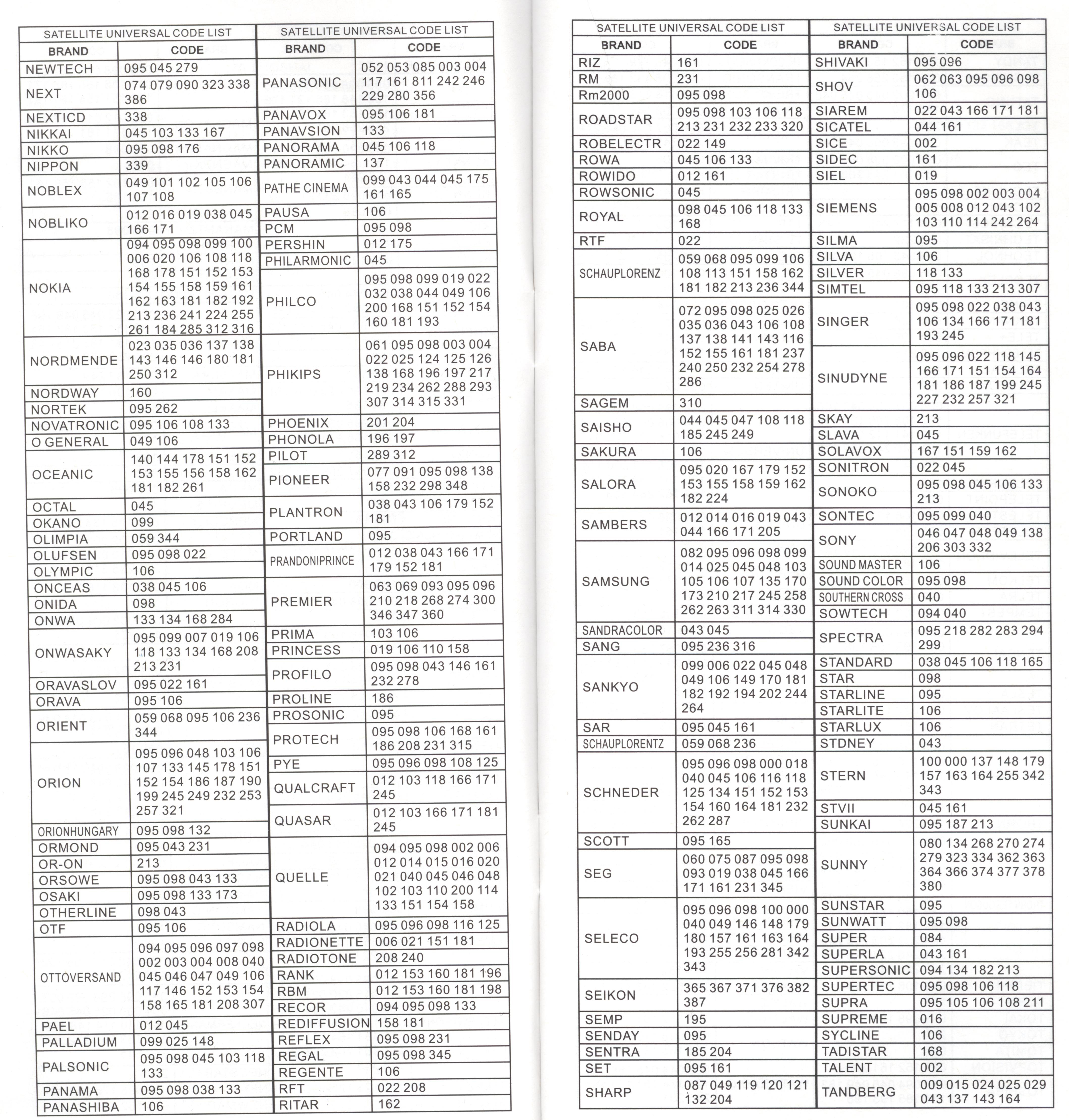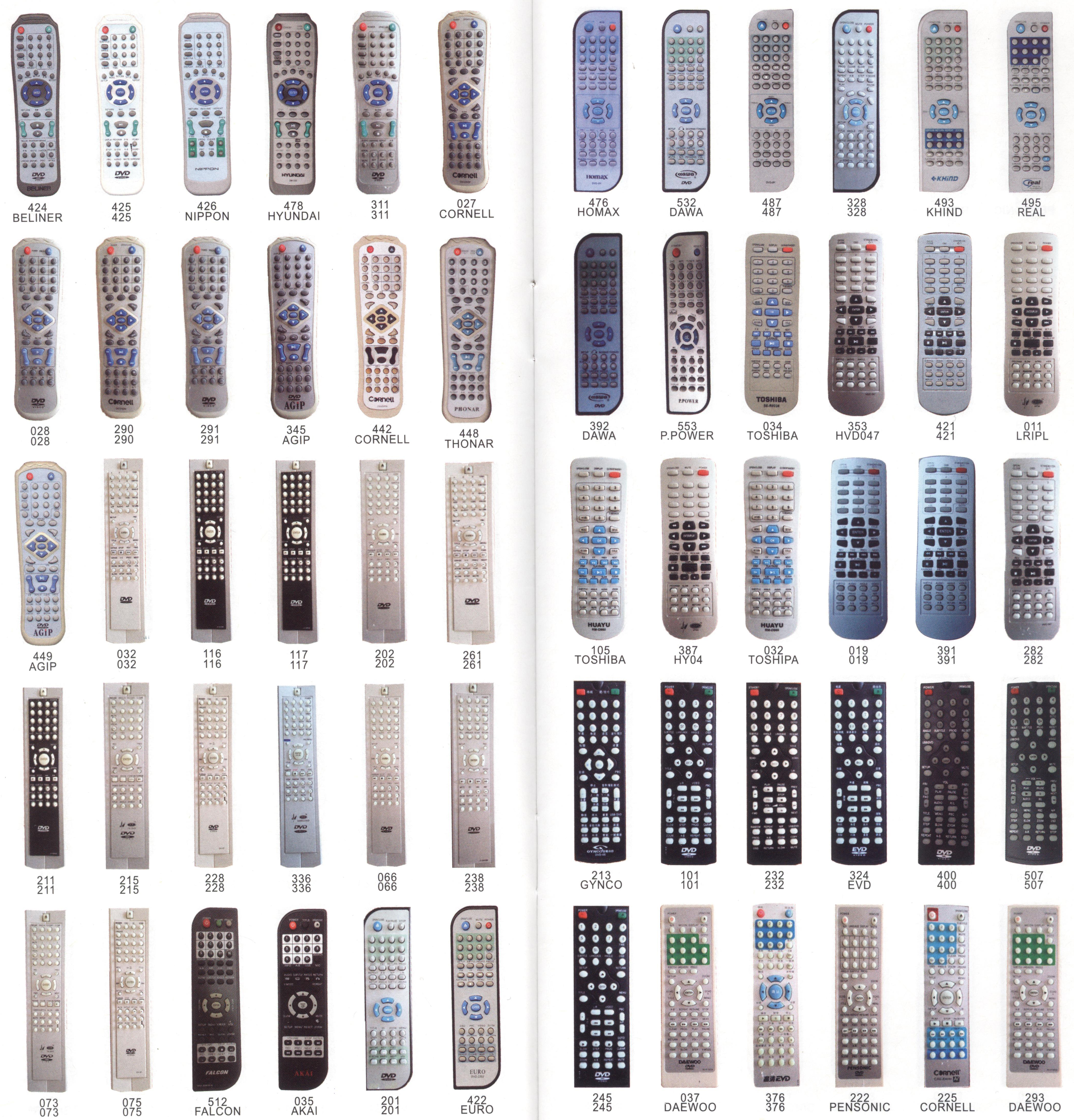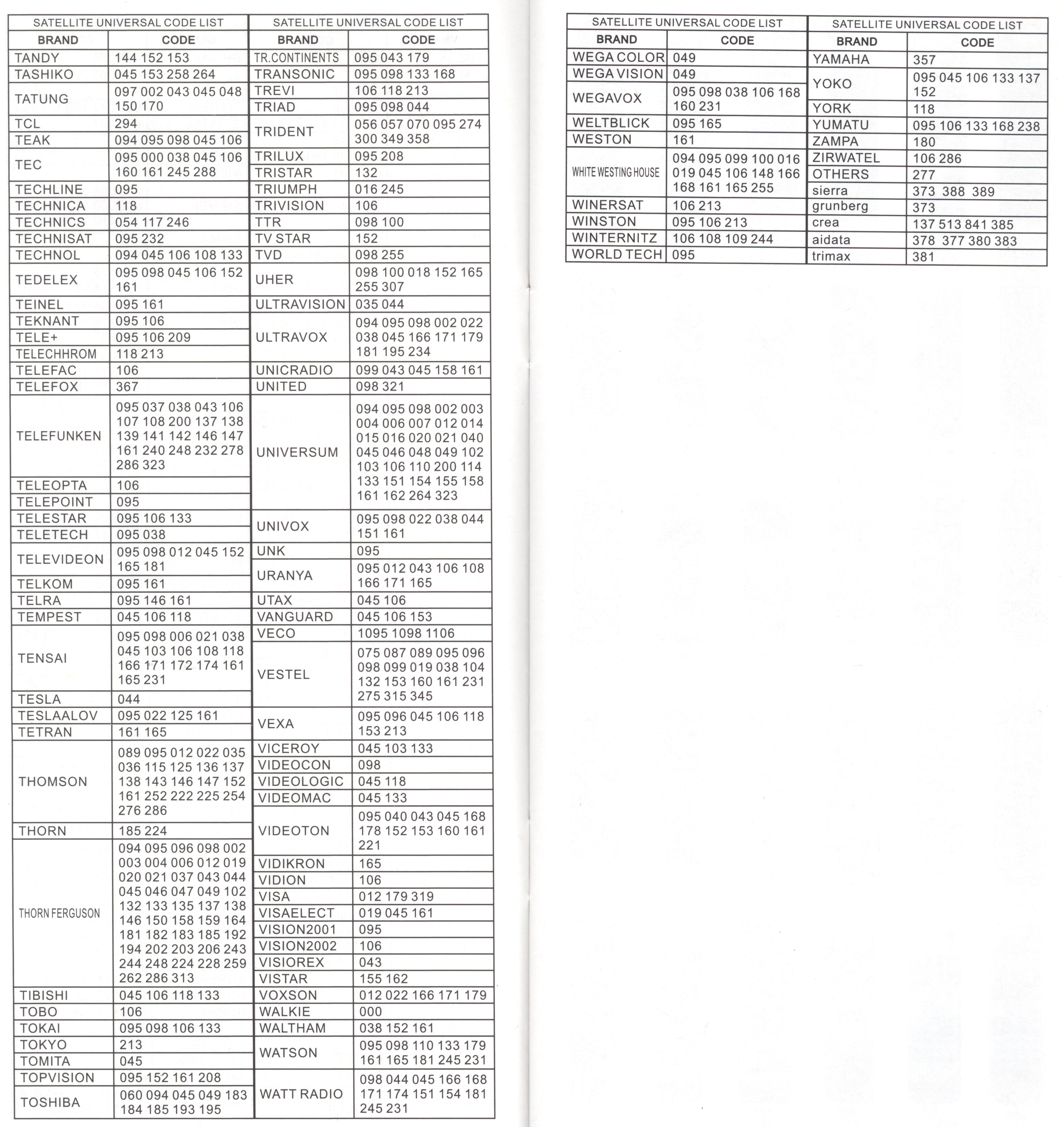 С помощью этого пульта вы сможете объединить до четырех пультов от разной техники в одном! Например, пульт от ТВ, DVD плеера, спутникового ресивера и музыкального центра! Настройка на ТВ, DVD и SAT производится ручным вводом кода или автопоиском кода, всего в базе более 3000 вариантов кодов! Пульт поддерживает как самые распространённые корейские, японские, европейские бренды, так и самые редкие китайские производители, например: LG, Samsung. Toshiba, Sony, Panasonic, Sharp, Supra, Mystery, Aiwa, Akai, Akira, Beko, Blaupunkt, Casio, Daewoo, Fujitsu, Funai, Goldstar, Grundig, Hisense, Hitachi, Hyundai, JVC, Loewe, Mitsubishi, Nec, Nokia, Orion, Pioneer, Shivaki, TCL, Telefunken, Thomson, Vestel, Yamaha и многие другие.