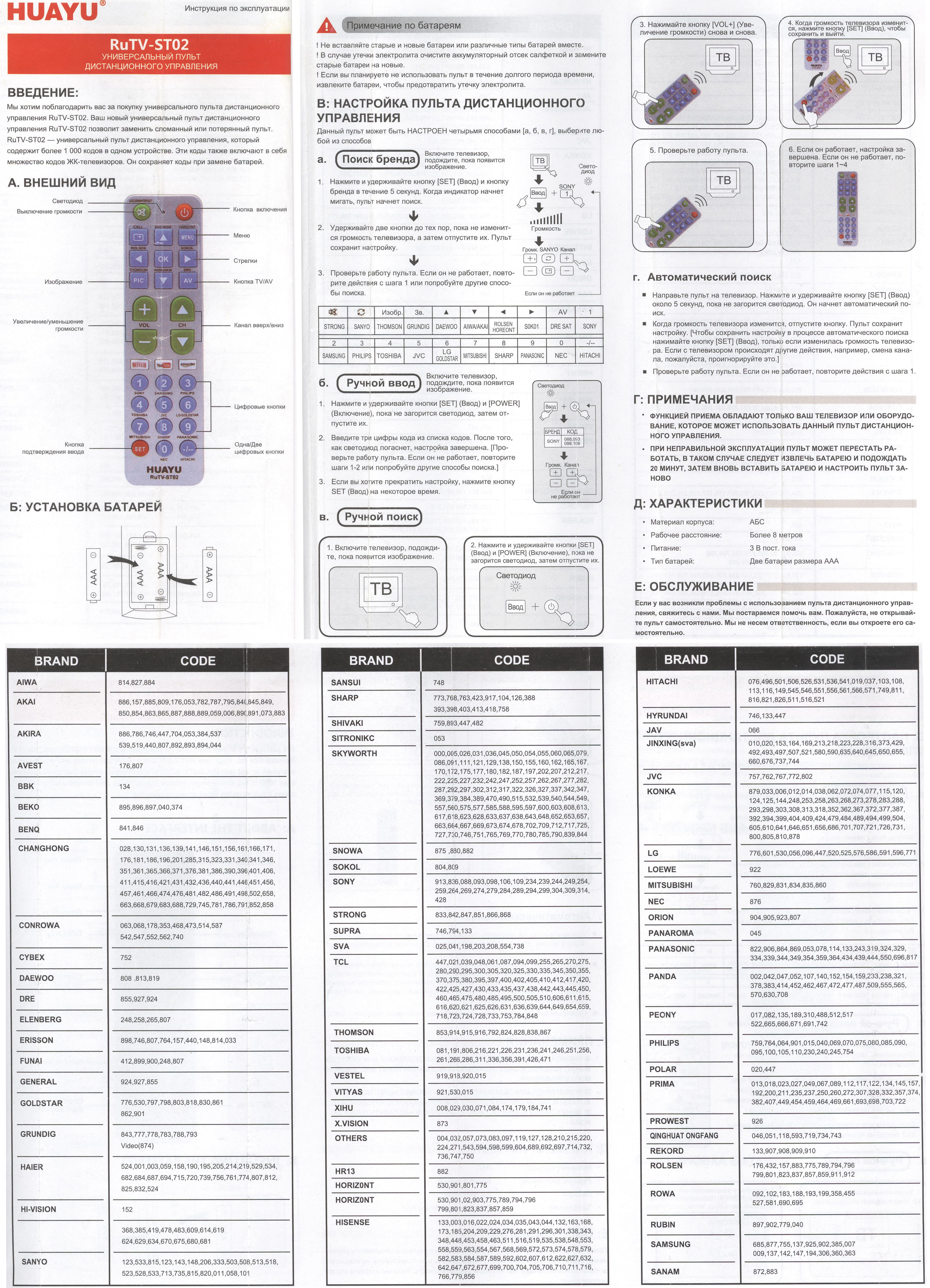 Инструкция на русском языке и таблица кодов в комплекте с каждым пультом.