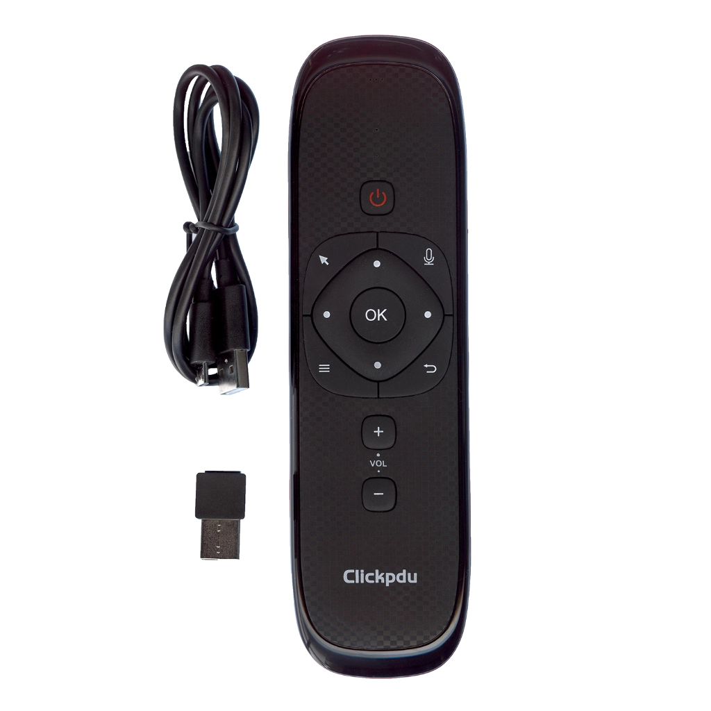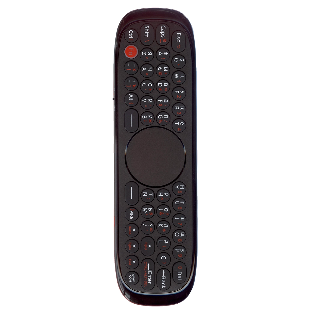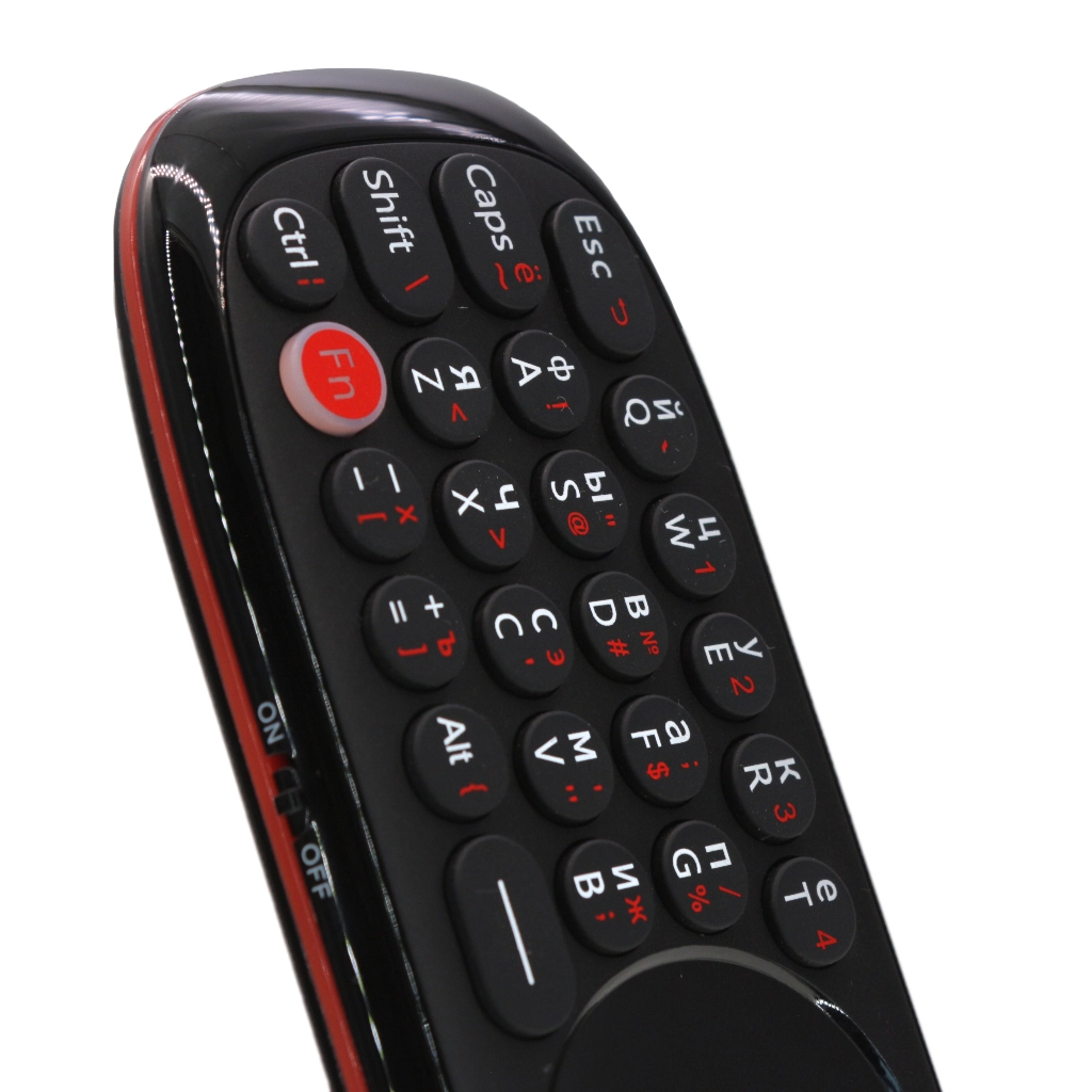 Универсальная аэромышь ClickPDU W2 Air Mouse - беспроводная аэромышь со встроенным гироскопом, тачпадом, голосовым управлением, кнопочным управлением основными функциями устройства, кириллической qwerty клавиатурой на обратной стороне, а так же возможность обучения кнопок ИК сигналам от другого пульта. Пульт способен осуществлять голосовое управление, управлять курсором и вводить текст с клавиатуры в системах Android IP TV, а так же управление голосовыми помощниками, управление курсором и ввод текста с клавиатуры на ПК с системами Windows, Linux, Mac OS (Яндекс.Алиса, Google ассистент, MAC OS Siri).