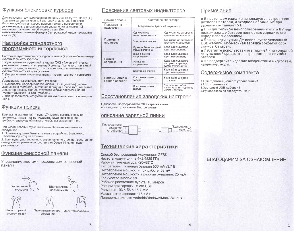 Пульт подключается с помощью передатчика, который устанавливается в свободный USB слот устройства. Комплектация: Пульт ДУ, USB передатчик, шнур USB, инструкция на русском языке.