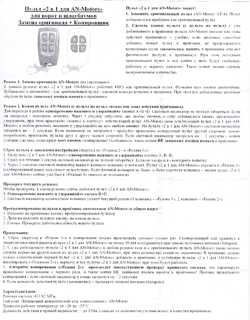 Пульт DUBLICATOR ДУБЛИКАТОР 2 в 1 для AN-Motors