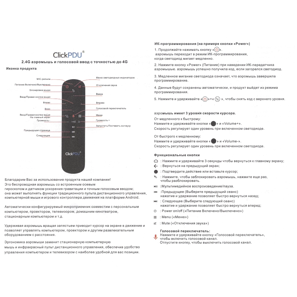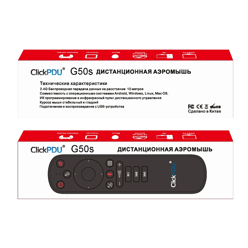Универсальный пульт ClickPDU G50S Air Mouse - беспроводная аэромышь со встроенным гироскопом, голосовым управлением, кнопочным управлением основными функциями устройства, а так же возможность обучения кнопки POWER от любого пульта. Пульт способен осуществлять голосовое управление в системах Android IP TV, а так же управление голосовыми помощниками на ПК с системами Windows, Linux, Mac OS (Яндекс.Алиса, Google ассистент, MAC OS Siri).