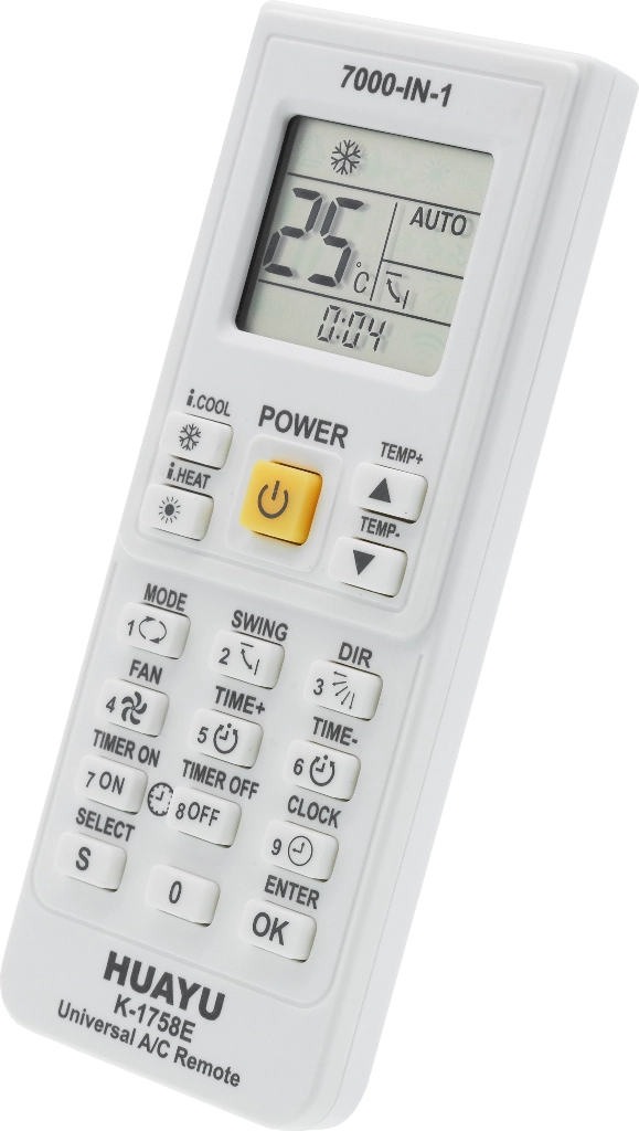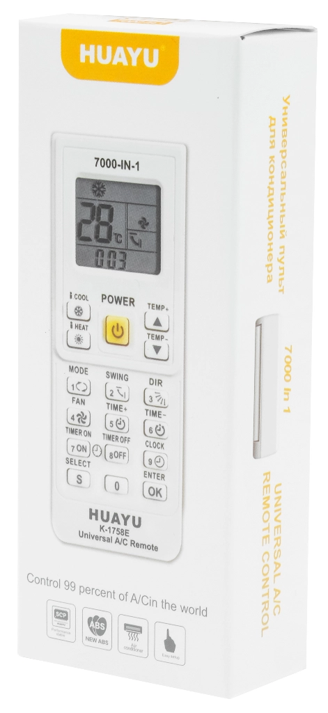 HUAYU K-1758E подходит для 99% различных марок кондиционеров, если они ранее управлялись с беспроводного пульта. Пульт высокого качества и легко настраивается с помощью ввода или автопоиска кода, подробная инструкция на русском языке в комплекте!