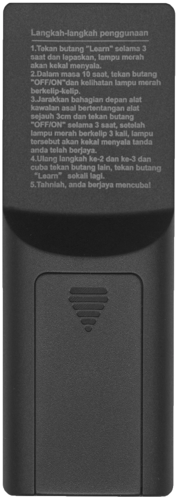 Пульт с функцией обучения. Для входя в режим обучения нажмите кнопку LEARN пока индикатор не загорится непрерывно. Затим нажмите кнопку, которую хотите обучить, например ON/OFF и индикатор начет мигать. Затем расположите оригинальный пульт напротив на расстояние 5 см направляю лампочки друг на друга и нажмите кнопку ON/OFF на родном пульте. Индикатор промигает и начнет опять гореть непрерывно - это означает успешное обучение. Повторите процедуру для остальных функций. Для выходя из режима обучения нажмите кнопку LEARN повторно.