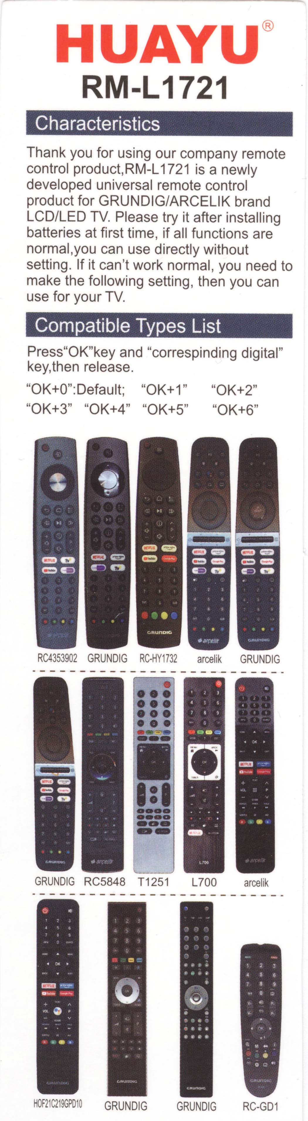 Всего в пульте 7 наборов сигналов, переключаются они комбинацией кнопок "ОК" + цифра от 0 до 6, по умолчанию пульт в режиме "ОК"+0. Например нажмите комбинацию ОК + 1 и попробуйте управлять ТВ, если не работает, попробуйте ОК+2 и так далее, пока пульт не заработает с вашим телевизором.