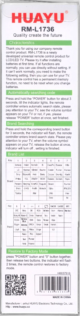 Пульт произведен в соответствии с высокими мировыми стандартами качества и безопасности, что подтверждается соответствующей сертификацией товаров HUAYU.
