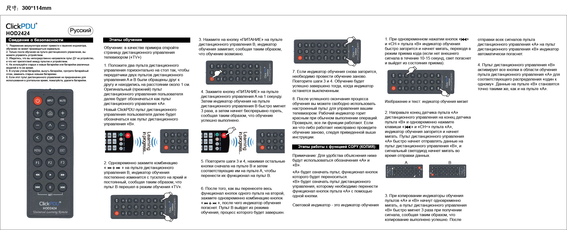 3. При копировании индикаторы обучения пультов «А» и «В» начнут одновременно мигать, а пульт дистанционного управления «В» быстро мигнет 3 раза при получении сигнала, сообщая таким образом, что копирование выполнено успешно. После отправки всех сигналов пульта дистанционного управления «А» на пульт дистанционного управления «В» индикатор автоматически погаснет.