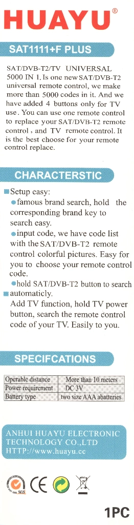 Купить "Пульт Huayu для SAT1111+F PLUS универсальный"