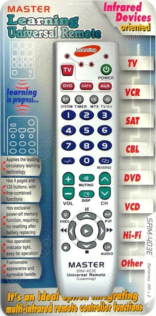 Обучаемый пульт на 4 утройства. Понимает сигналы пультов различных фирм и устройств, имеет простое обучение. В практике магазина не редко бывают ситуации, когда клиенты хотели обучить более дорогие и фирменные пульты на управление своими устройствами, но пульты не знали этих кодировок, а при попытке обучить эту модель пульта, всё получалось. Пульт рекомендован ClickPDU.ru!