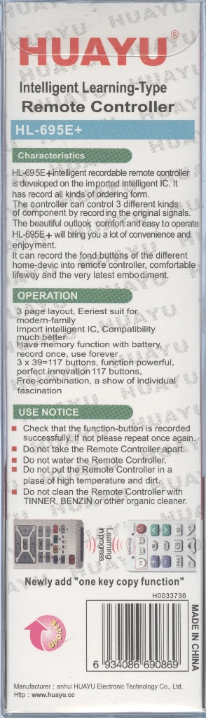 У пульта есть уникальная возможность быстрого копирования сигналов с уже обученного пульт HL-695E на новые пульты HL-695E, сделано это для удобного и быстрого создания копий пультов, особенно актуально например в гостиницах для ТВ пультов или в учебных заведениях где нужно сделать много одинаковых пультов для проекторов или интерактивных досок.
