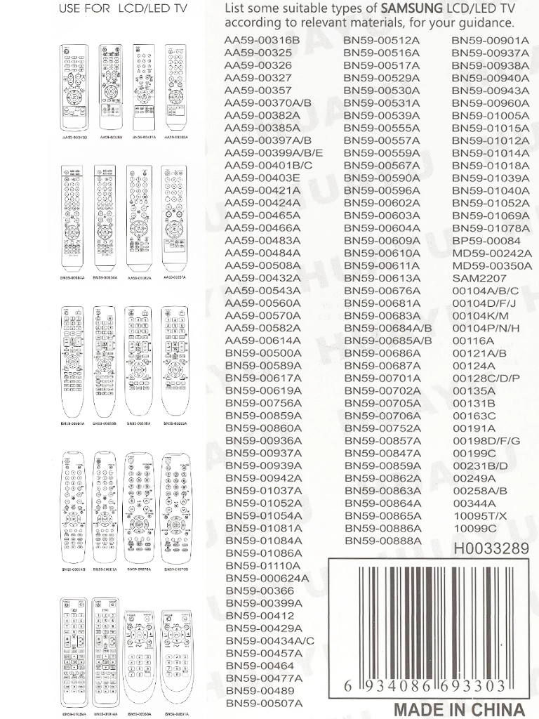 AA59-00316B BN59-00512A BN59-00901A AA59-00325 BN59-00516A BN59-00937A AA59-00326 BN59-00517A BN59-00938A AA59-00327 BN59-00529A BN59-00940A AA59-00357 BN59-00530A BN59-00943A AA59-00370A/B BN59-00531A BN59-00960A AA59-00382A BN59-00539A BN59-01005A AA59-00385A BN59-00555A BN59-01015A AA59-00397A BBN59-00557A BN59-01012A AA59-00399A/B/E BN59-00559A BN59-01014A AA59-00401B/C BN59-00567A BN59-01018A AA59-00403E BN59-00590A BN59-01039A AA59-00421A BN59-00596A BN59-01040A AA59-00424A BN59-00602A BN59-01052A AA59-00465A BN59-00603A BN59-01069A AA59-00466A BN59-00604A BN59-01078A AA59-00483A BN59-00609A BP59-00084 AA59-00484A BN59-00610A MD59-00242A AA59-00508A BN59-00611A MD59-00350A AA59-00432A BN59-00613A SAM2207 AA59-00543A BN59-00676A 00104A/B/C AA59-00560A BN59-00681A 00104D/F/J AA59-00570A BN59-00683A 00104K/M AA59-00582A BN59-00684A/B 00104P/N/H AA59-00614A BN59-00685A/B 00116A BN59-00500A BN59-00686A 00121A/B BN59-00589A BN59-00687A 00124A BN59-00617A BN59-00701A 00128C/D/P BN59-00619A BN59-00702A 00135A BN59-00756A BN59-00705A 00131B BN59-00859A BN59-00706A 00163C BN59-00860A BN59-00752A 00191A BN59-00936A BN59-00857A 00198D/F/G BN59-00937A BN59-00847A 00199C BN59-00939A BN59-00859A 00231B/D BN59-00942A BN59-00862A 00249A BN59-01037A BN59-00863A 00258A/B BN59-01052A BN59-00864A 00344A BN59-01054A BN59-00865A 10095T/X BN59-01081A BN59-00886A 10099C BN59-01084A BN59-00888A H0033289 BN59-01086A BN59-01110A BN59-000624A BN59-00366 BN59-00399A BN59-00412 BN59-00429A BN59-00434A/C BN59-00457A BN59-00464 BN59-00477A BN59-00489 934086 693303 BN59-00507A