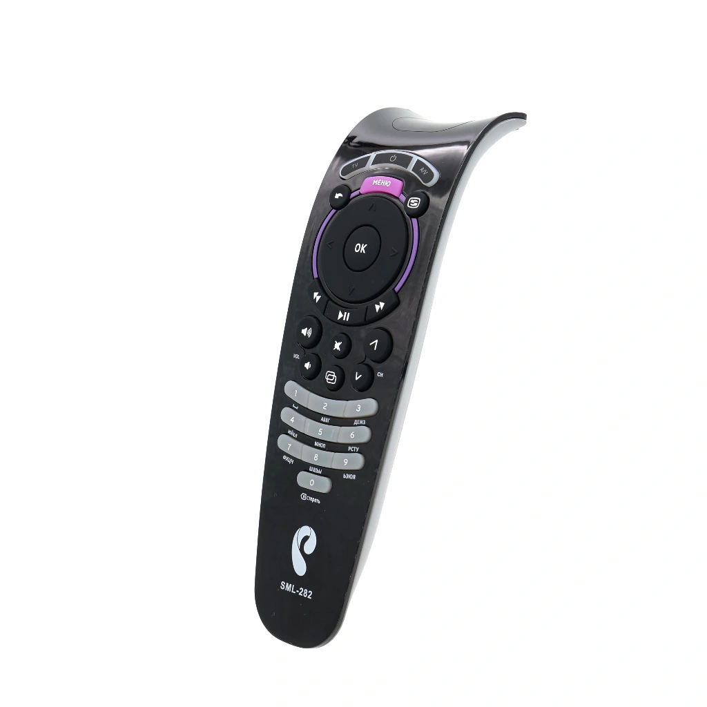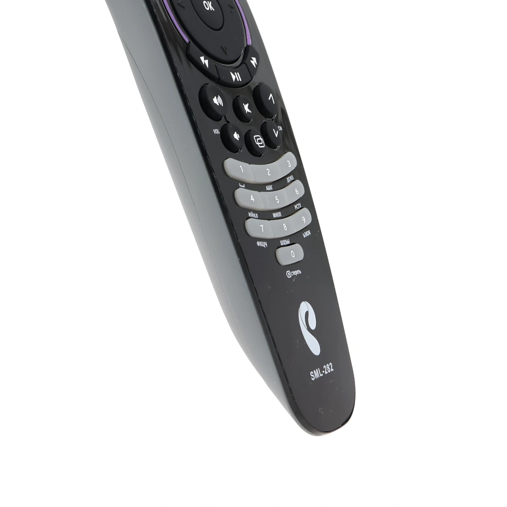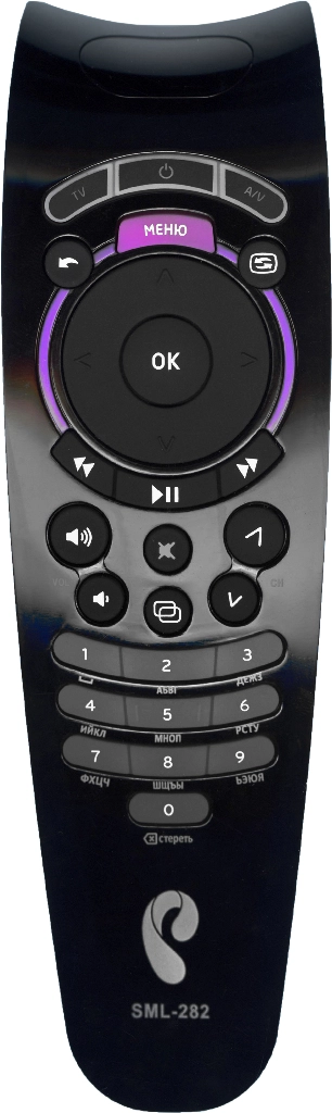 Несмотря на свое предназначение, для которого все и решают купить пульт Ростелеком SML-282 HD, устройство можно также использовать для включения и управления громкостью телевизоров. После специальной настройки пульт SML-282 сможет стать небольшой заменой для большинства телевизоров популярных производителей. Это универсальный пульт, который способен работать не только с приставкой! На пульте имеется русифицированная клавиатура и довольно большие, удобные в управлении кнопки. Корпус и практически все кнопки выполнены в строгом стиле, с преобладанием темных тонов. Ярким фиолетовым цветом выделена лишь кнопка Меню. Возле клавиши включения/выключения расположились режим телевидения и переключение видеовхода. Работает пульт от двух мизинчиковых батареек, которых нет в комплекте.