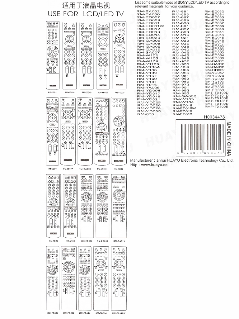 Универсальный пульт HUAYU для телевизоров бренда SONY