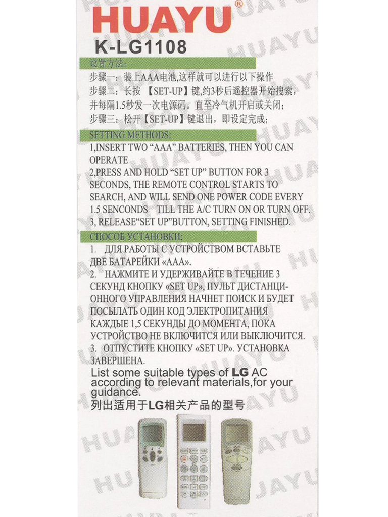 Разработан компанией Huayu специально для кондиционеров марки LG. Подойдет практически для любого кондиционера LG управляемого с беспроводного пульта.