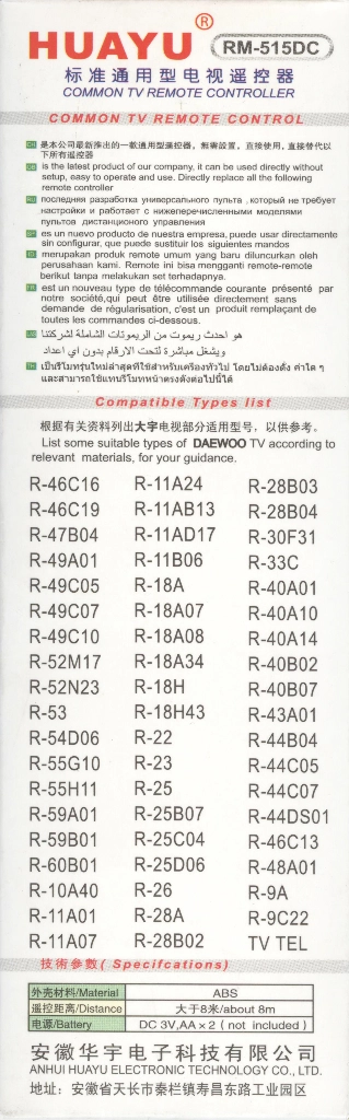 Универсальный пульт HUAYU RM-515DC для телевизоров марки DAEWOO!